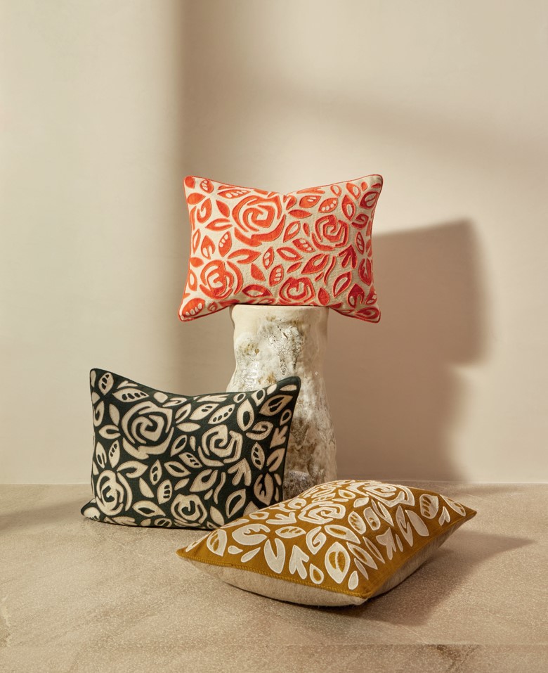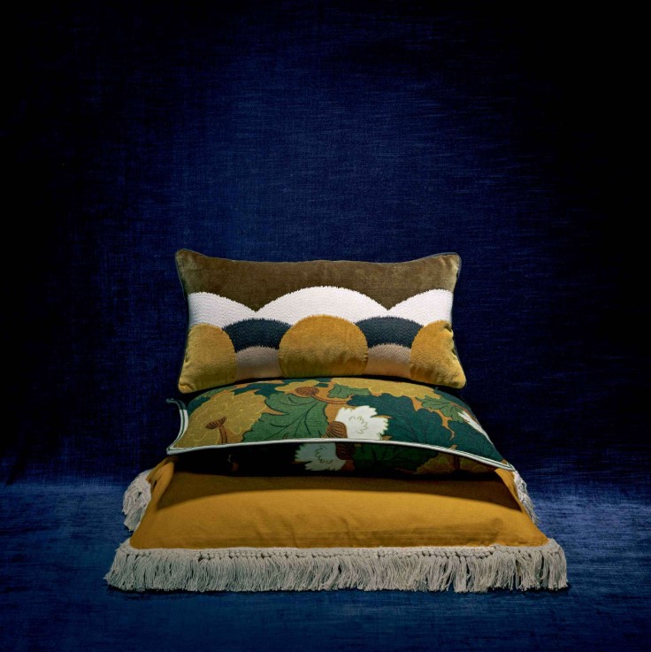 La broderie constitue l'âme de ces coussins d'exception, révélant un savoir-faire minutieux où chaque point compte. Les motifs se déclinent en une palette riche et audacieuse, créant des effets de matière et de relief qui captent la lumière.